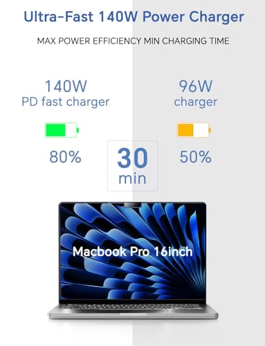 Superfast 140W Charging: That includes a formidable 140W output, this charger delivers lightning-fast charging speeds, outpacing customary 96W and 70W chargers. It might probably cost your 14/16-inch MacBook Professional or 13/15-inch MacBook Air from 0% to 60-80% in simply half-hour, guaranteeing uninterrupted productiveness even with power-hungry M1, M2, and M3 Professional Max chips.
